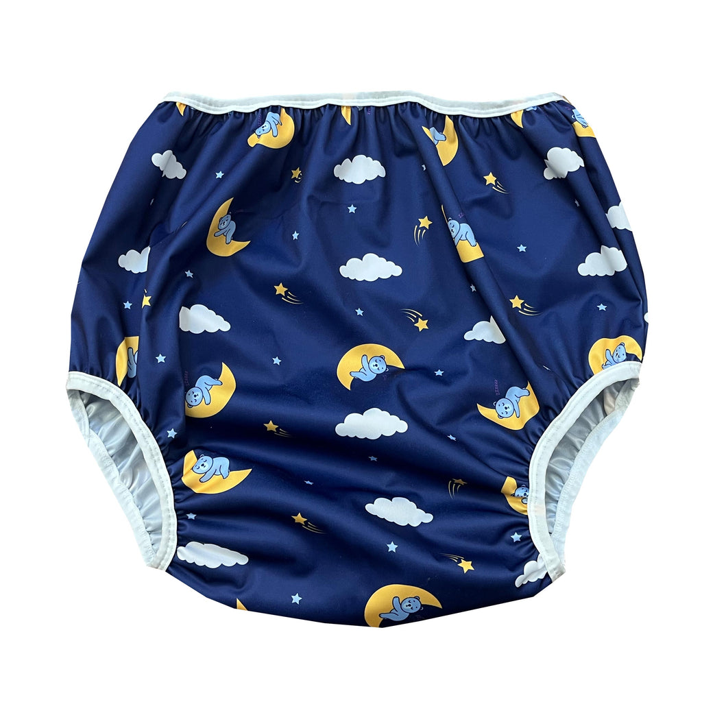Sleepy Bear is made with a 100% polyester knit, this waterproof pant features a polyurethane waterproof coating on the inside. It is soft, quiet, cool and breathable. Lycra waist and leg elastic bands - soft and does not pinch the skin. Machine wash using warm water and a mild detergent. Hang to dry or tumble dry on low with a clean dry towel.